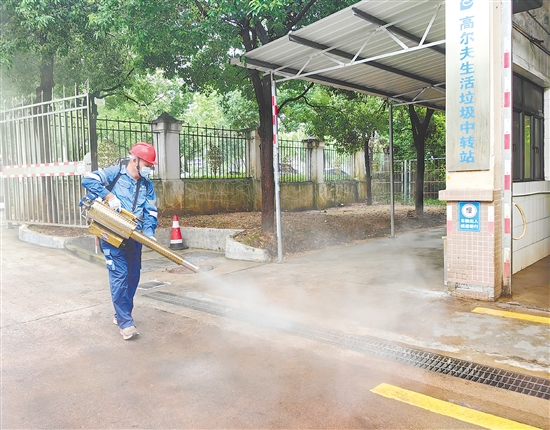 ??? 江門日報(bào)訊 (文/圖 記者/蔡昭璐 通訊員/江城管) 8月2日下午2時(shí)許,在蓬江區(qū)新昌路高爾夫生活垃圾中轉(zhuǎn)站,環(huán)衛(wèi)工人手持金屬噴霧槍,對垃圾中轉(zhuǎn)站內(nèi)部、周邊綠化帶、排水渠等重點(diǎn)區(qū)域展開消殺作業(yè),以有效降低蚊蟲密度,防控基孔肯雅熱、登革熱等蚊媒傳染病。