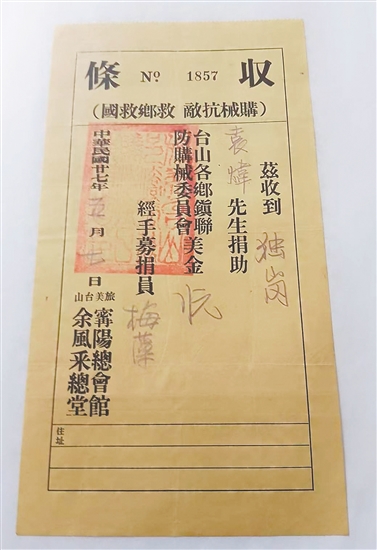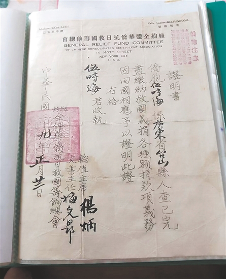 ????據(jù)統(tǒng)計(jì),李春榮累計(jì)捐贈(zèng)史料達(dá)214件(份),其中不乏極具歷史價(jià)值的華僑捐款憑證,包括《紐約全體華僑抗日救國籌餉總會(huì)證明書》《華僑拒日救國后援總會(huì)捐款收條》《旅美臺(tái)山寧陽總會(huì)館、余風(fēng)采總堂抗敵救鄉(xiāng)救國捐款收條》《墨西哥尾利打抗日救國后援會(huì)捐款收條》等。