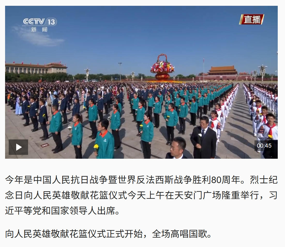 獨(dú)家視頻丨向人民英雄敬獻(xiàn)花籃儀式正式開(kāi)始 全場(chǎng)高唱國(guó)歌