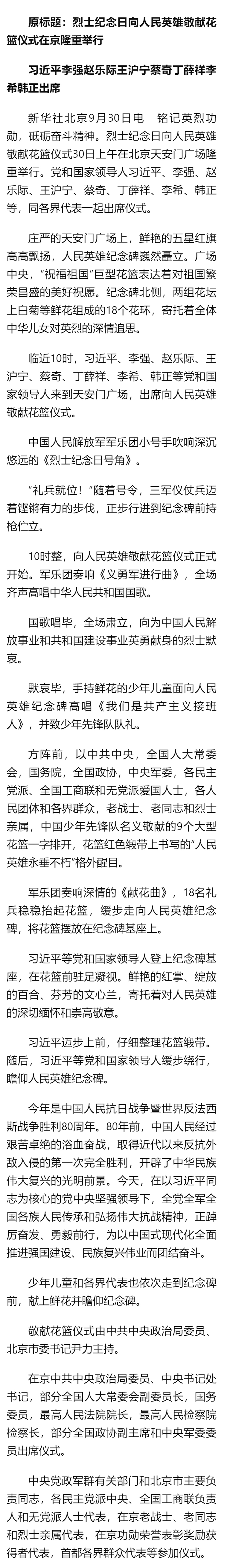 烈士紀念日向人民英雄敬獻花籃儀式在京隆重舉行 習(xí)近平等黨和國家領(lǐng)導(dǎo)人出席