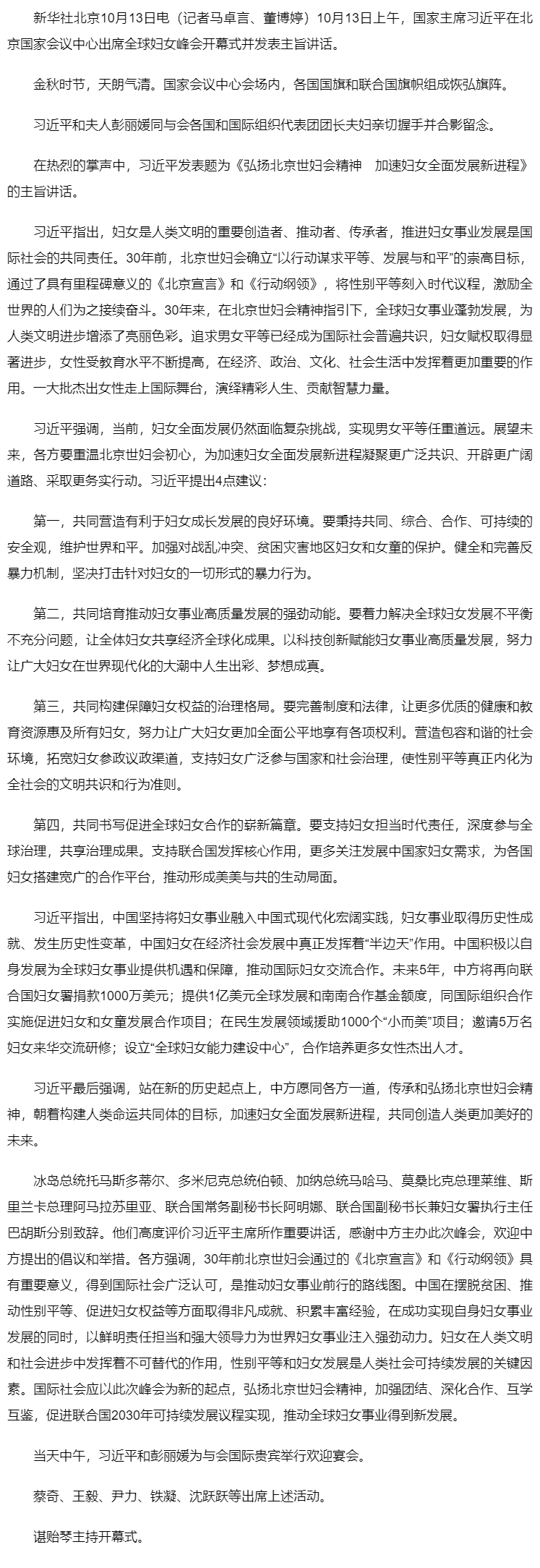 習(xí)近平出席全球婦女峰會(huì)開(kāi)幕式并發(fā)表主旨講話