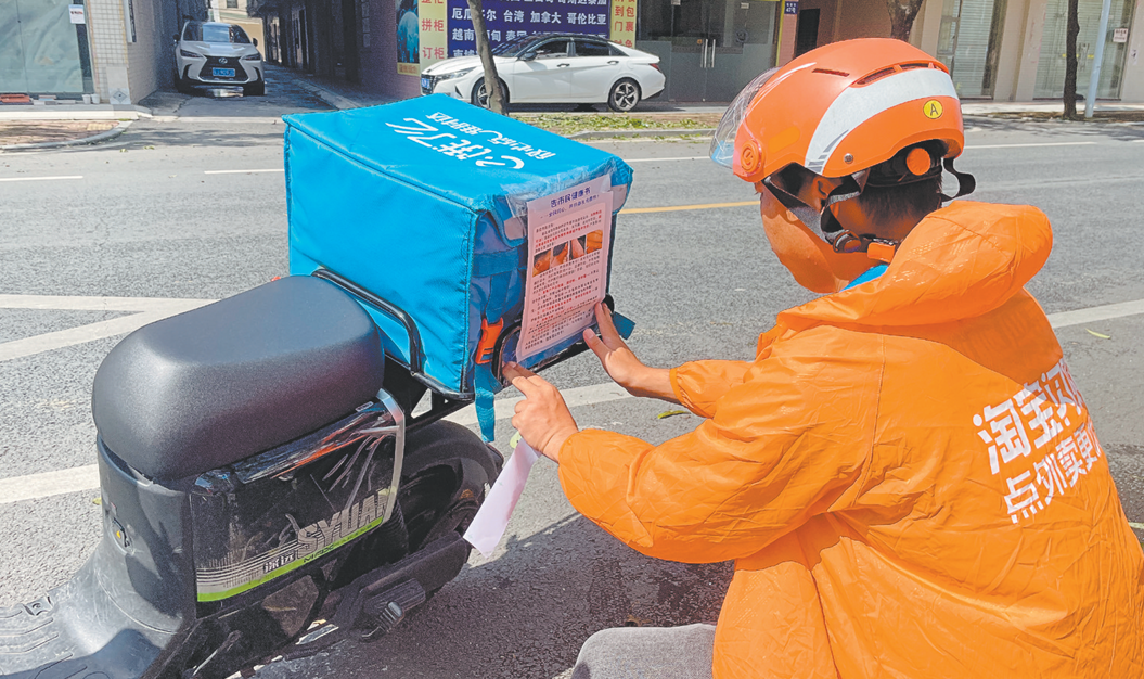 ????鶴山動員快遞員、外賣騎手、網(wǎng)約車司機等新就業(yè)群體參與疫情防控,組建了由順豐、EMS、美團、餓了么等企業(yè)騎手和快遞員組成的網(wǎng)約配送行業(yè)志愿服務隊。騎手利用等待出餐的3至5分鐘,提醒商戶清理后廚排水溝等風險區(qū)域,動員沿街商戶加入聯(lián)防聯(lián)控網(wǎng)絡。