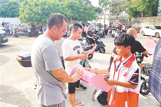 學(xué)生志愿者向等候接孩子的家長發(fā)放基孔肯雅熱防控宣傳單。