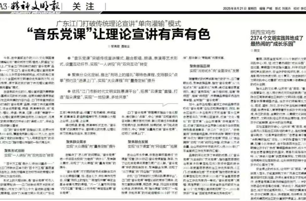 《精神文明報》關(guān)注江門“音樂黨課”,讓理論宣講有聲有色
